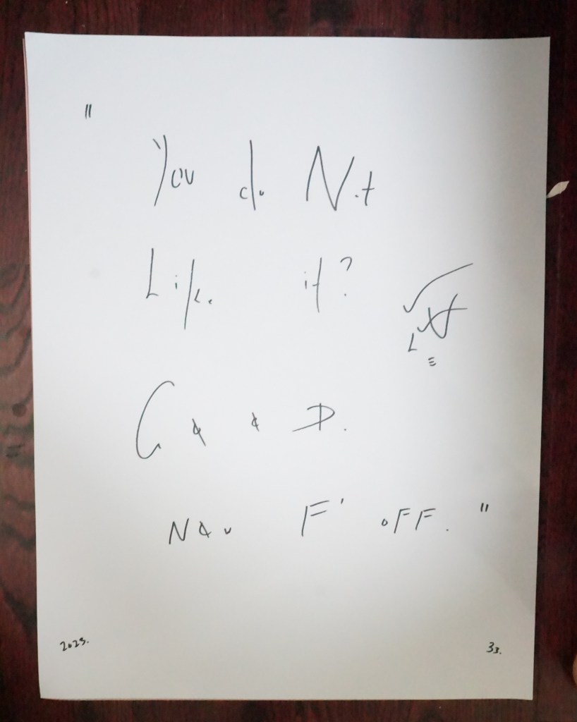 33 – “You Do Not Like It? Good. Now F’ Off” (2023) – (Marker on 19.5 x 25.5 Bristol Paper) 33 the Artist © 2023. All Rights Reserved. Share this: Click to share on X (Opens in new window) X Click to share on Facebook (Opens in new window) Facebook Like Loading... Related