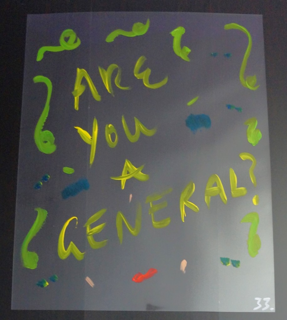 33 – Are You A General? (2026) – Acrylic on 16×20 Plastic Paper 33 the Artist © 2026. All Rights Reserved. Share this: Share on X (Opens in new window) X Share on Facebook (Opens in new window) Facebook Like Loading... Related