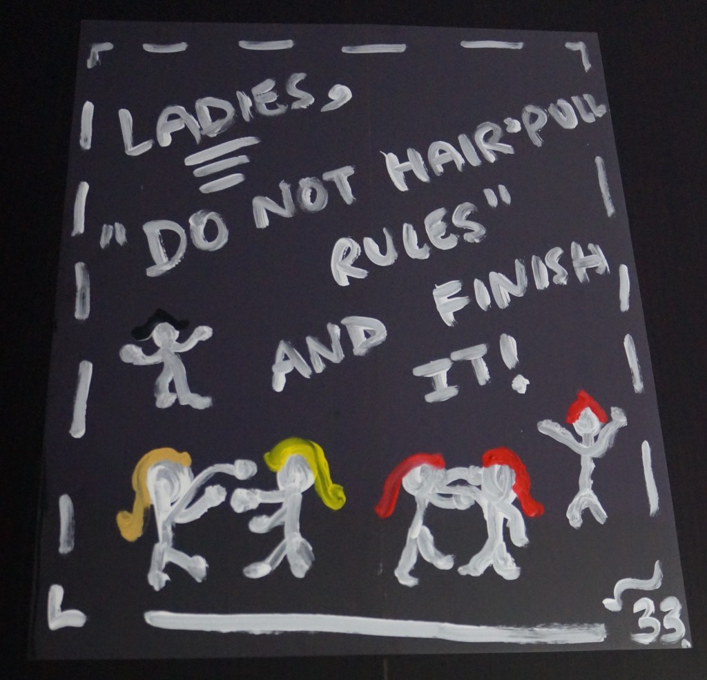 33 – Ladies, “Do not Hair’pull Rules” and Finish It! (2026) – Acrylic on 16×20 Plastic Paper 33 the Artist © 2026. All Rights Reserved. Share this: Share on X (Opens in new window) X Share on Facebook (Opens in new window) Facebook Like Loading... Related
