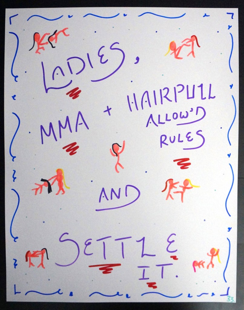 33 – Ladies, MMA + Hairpull Allow’d Rules and Settle It. (2026) – Marker on 22×28 Bristol Board 33 the Artist © 2026. All Rights Reserved. Share this: Share on X (Opens in new window) X Share on Facebook (Opens in new window) Facebook Like Loading... Related