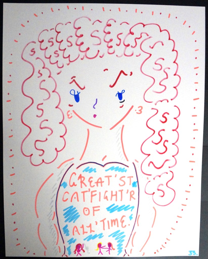 33 – Great’st Cat’fight’r of All’Time. (2026) – Marker on 22×28 Bristol Board 33 the Artist © 2015 – Present. All Rights Reserved. Share this: Share on X (Opens in new window) X Share on Facebook (Opens in new window) Facebook Like Loading... Related