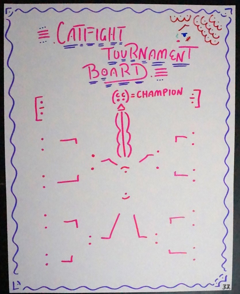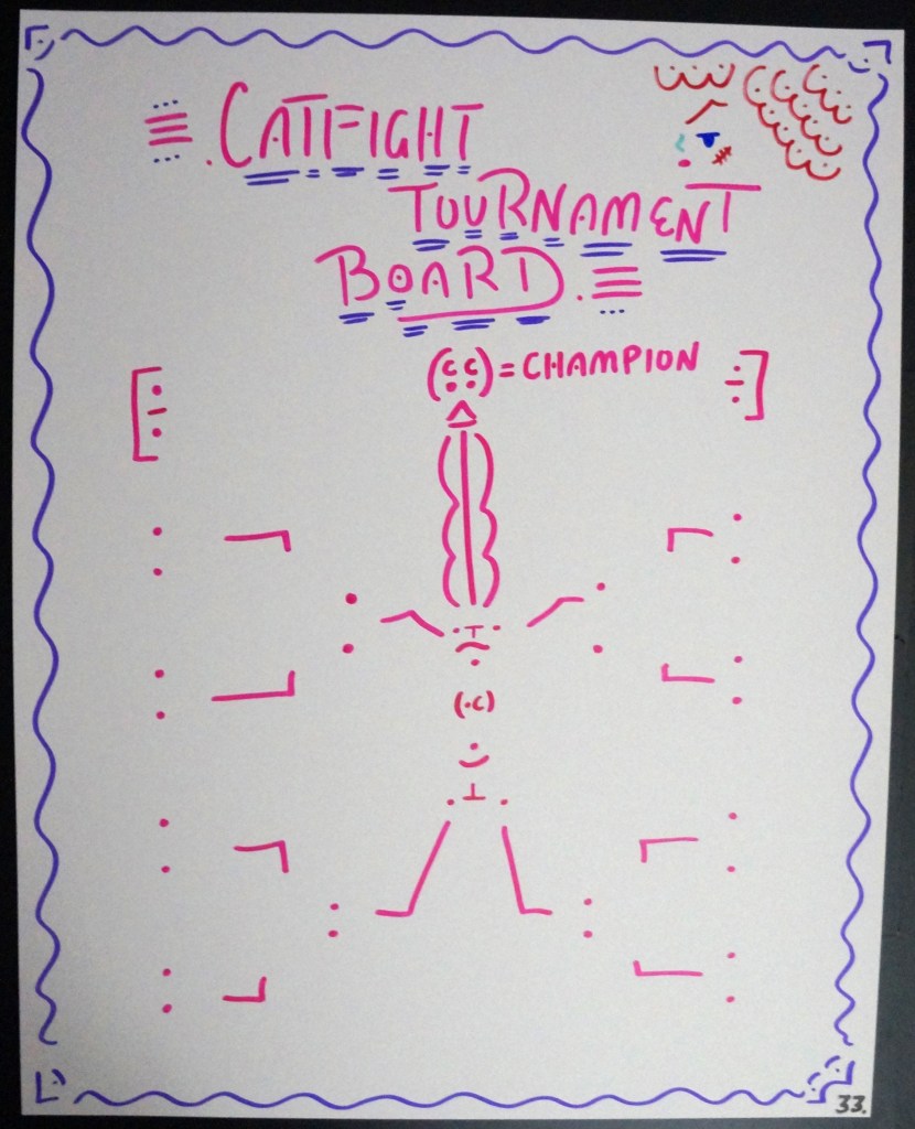 33 – Catfight Tournament Board. (2026) – Marker on 22×28 Bristol Board 33 the Artist © 2015 – Present. All Rights Reserved. Share this: Share on X (Opens in new window) X Share on Facebook (Opens in new window) Facebook Like Loading... Related