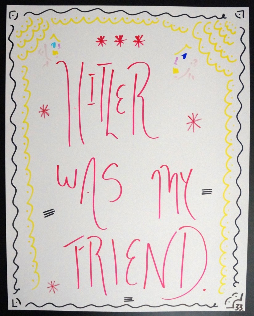 33 – Hitler Was My Friend. (2026) – Marker on 22×28 Bristol Board 33 the Artist © 2015 – Present. All Rights Reserved Share this: Share on X (Opens in new window) X Share on Facebook (Opens in new window) Facebook Like Loading... Related
