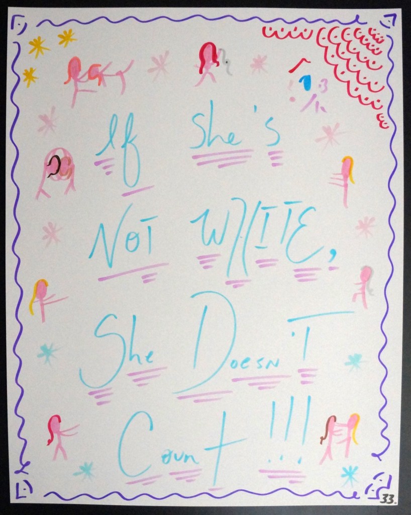 33 – If She’s Not White, She Doesn’t Count!!! (2026) – Marker on 22×28 Bristol Board 33 the Artist © 2015 – Present. All Rights Reserved Share this: Share on X (Opens in new window) X Share on Facebook (Opens in new window) Facebook Like Loading... Related