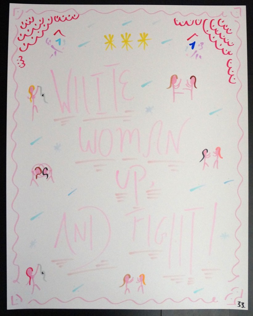 33 – White Woman Up, And Fight! (2026) – Marker on 22×28 Bristol Board 33 the Artist © 2015 – Present. All Rights Reserved. Share this: Share on X (Opens in new window) X Share on Facebook (Opens in new window) Facebook Like Loading... Related