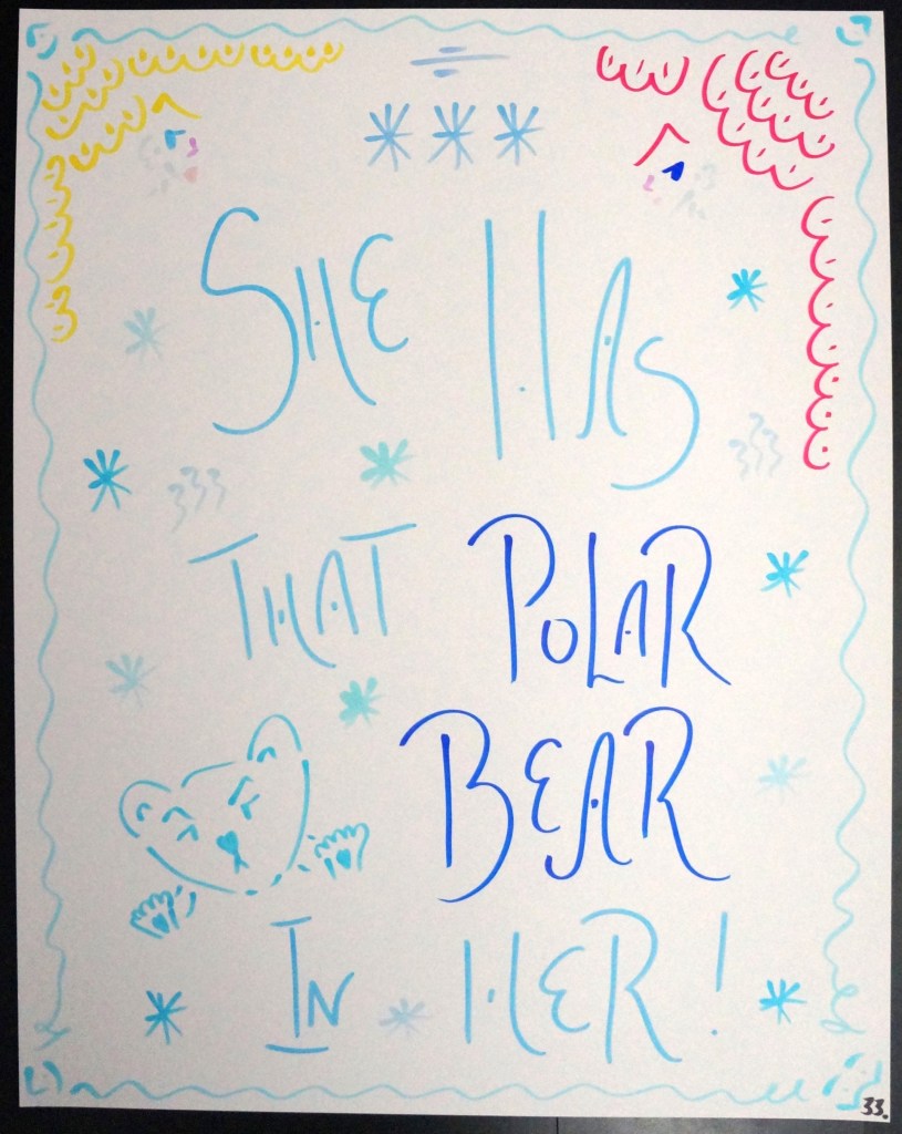 33 – She Has That Polar Bear In Her! (2026) – Marker on 22×28 Bristol Board 33 the Artist © 2015 – Present. All Rights Reserved. Share this: Share on X (Opens in new window) X Share on Facebook (Opens in new window) Facebook Like Loading... Related