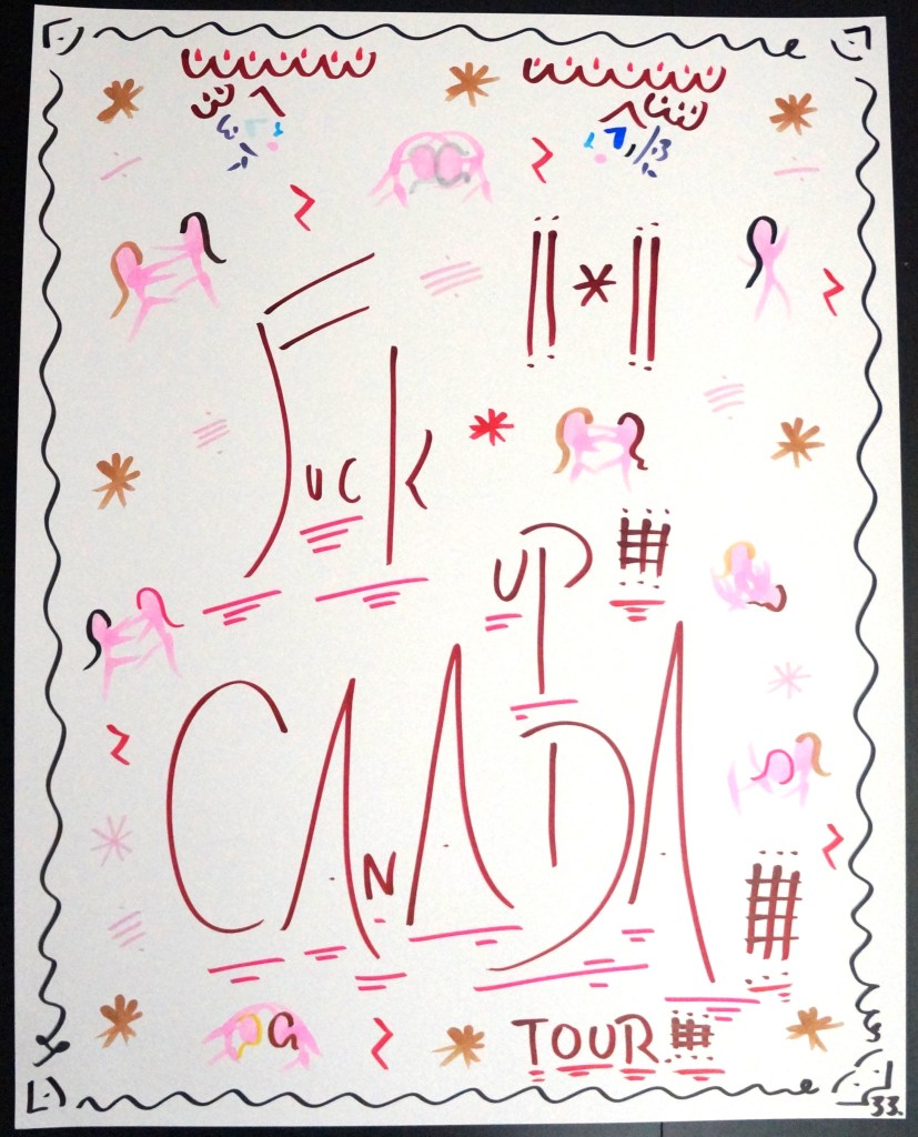 33 – Fuck Up Canada Tour. (2026) – Marker on 22×28 Bristol Board 33 the Artist © 2015 – Present. All Rights Reserved. Share this: Share on X (Opens in new window) X Share on Facebook (Opens in new window) Facebook Like Loading... Related
